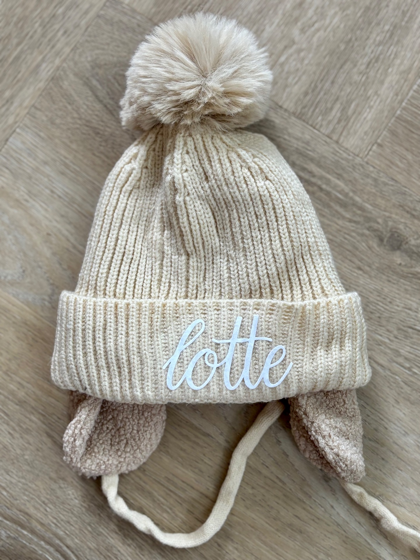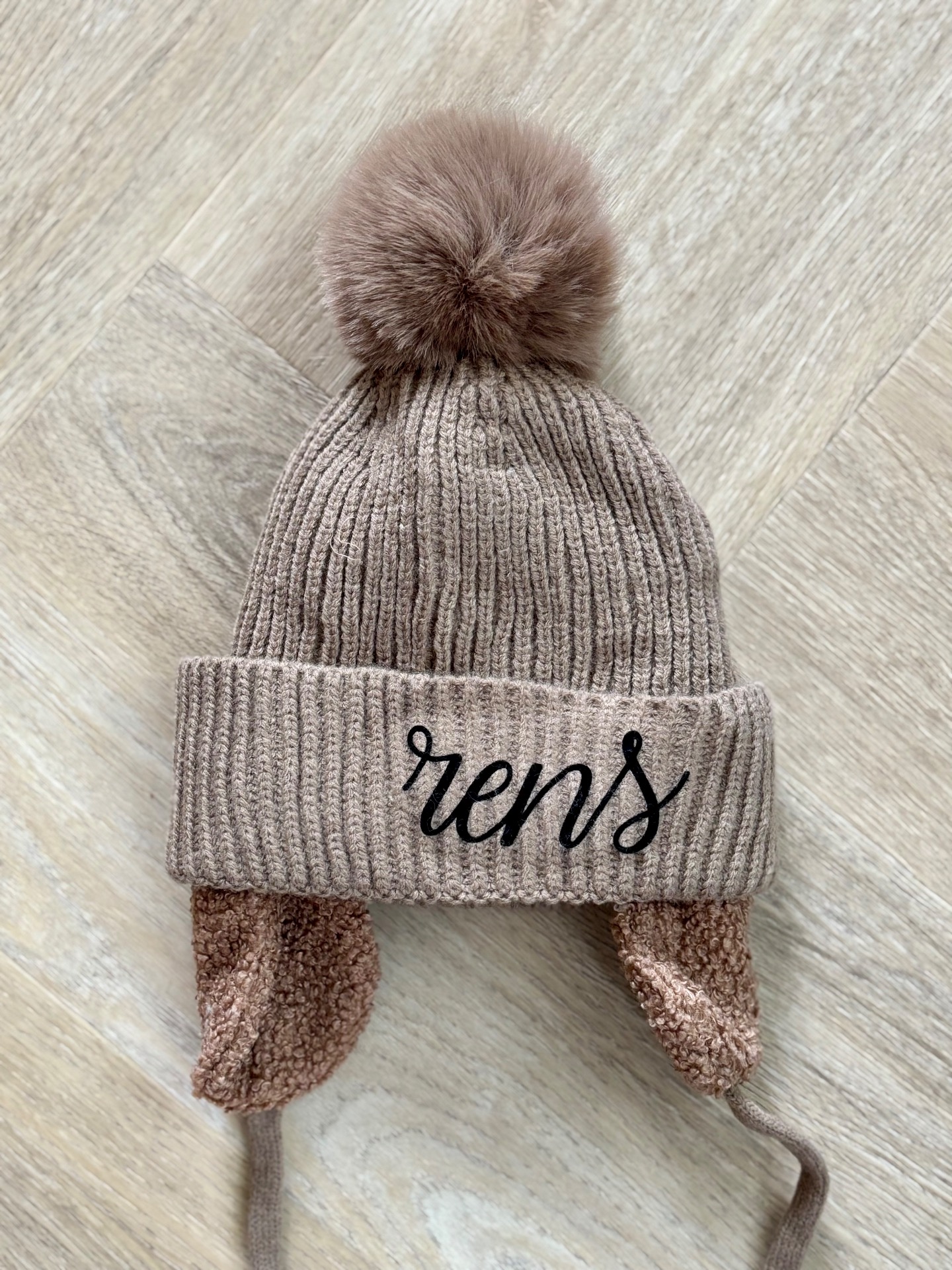 De muts is van Rammelaartje en wordt gepersonaliseerd met wit of zwart Flock.