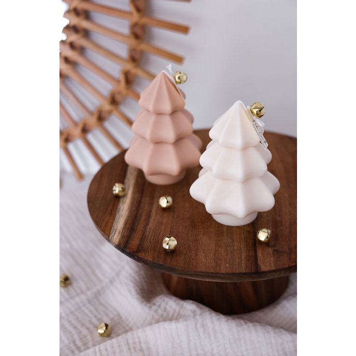 Handgemaakte kaars in kerstboomvorm van Niki candle. De kerstboomkaars is gemaakt van pure raapzaadwas en katoen. Het is vegan en biologisch afbreekbaar.
