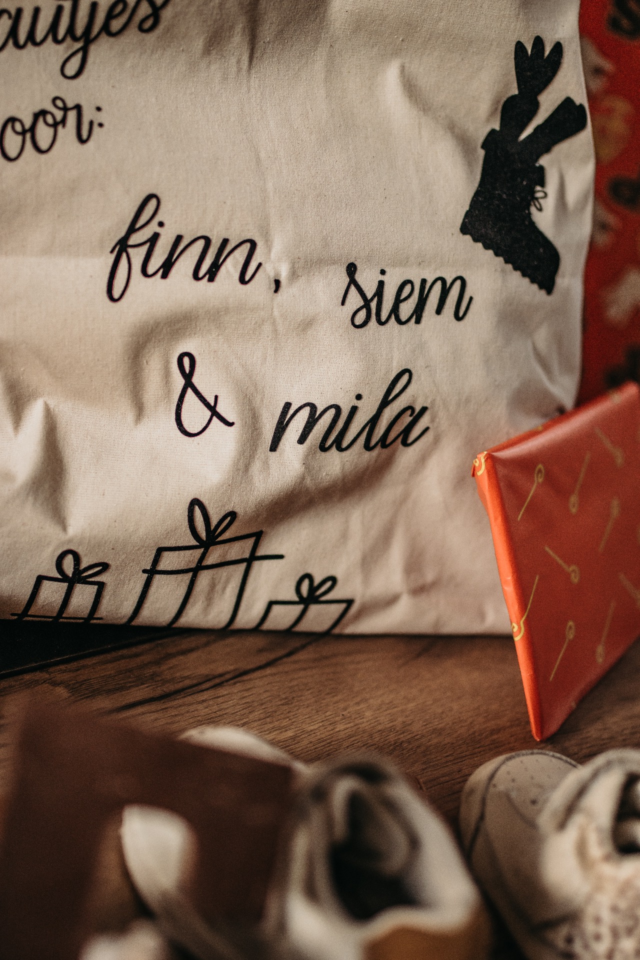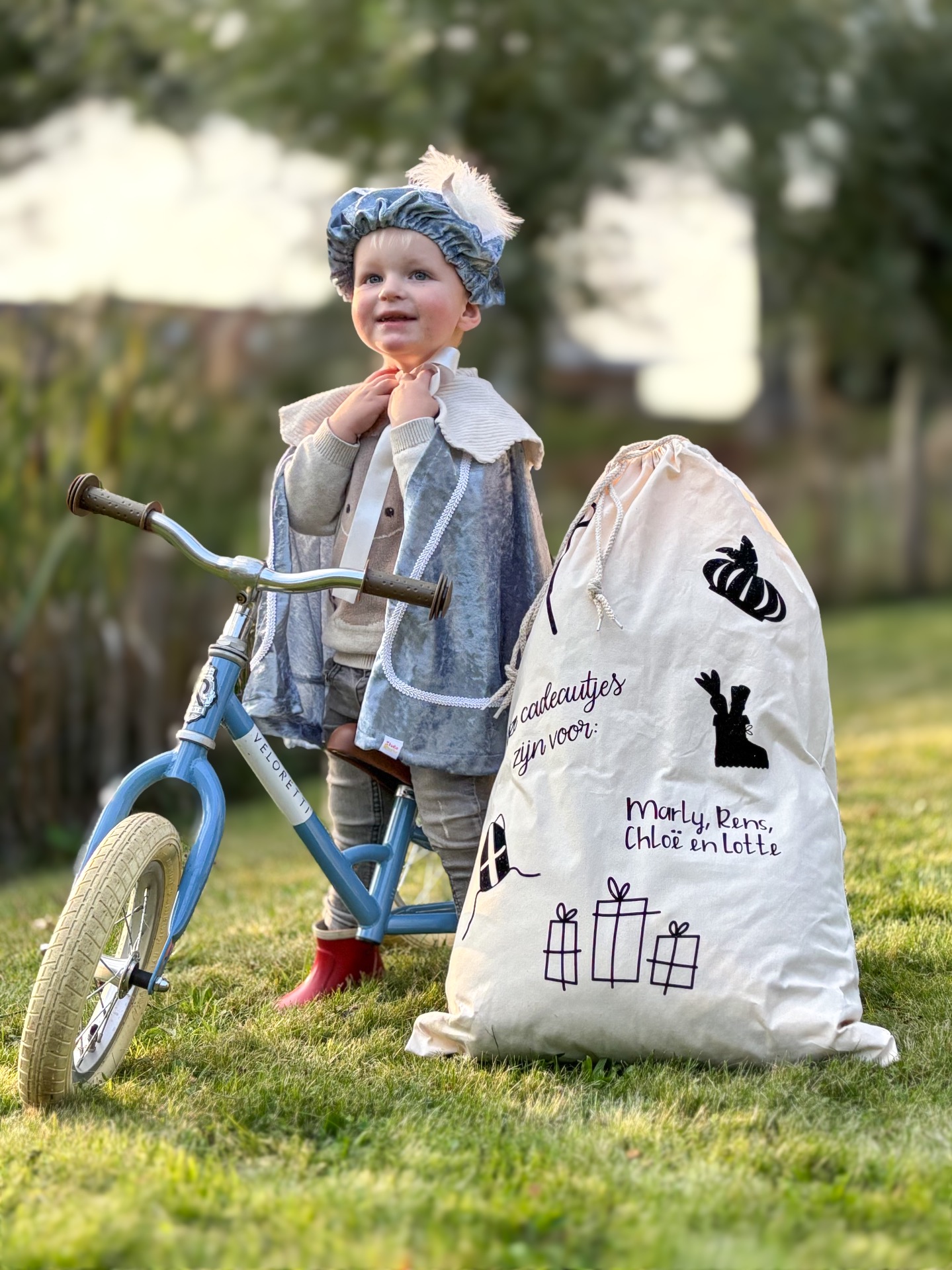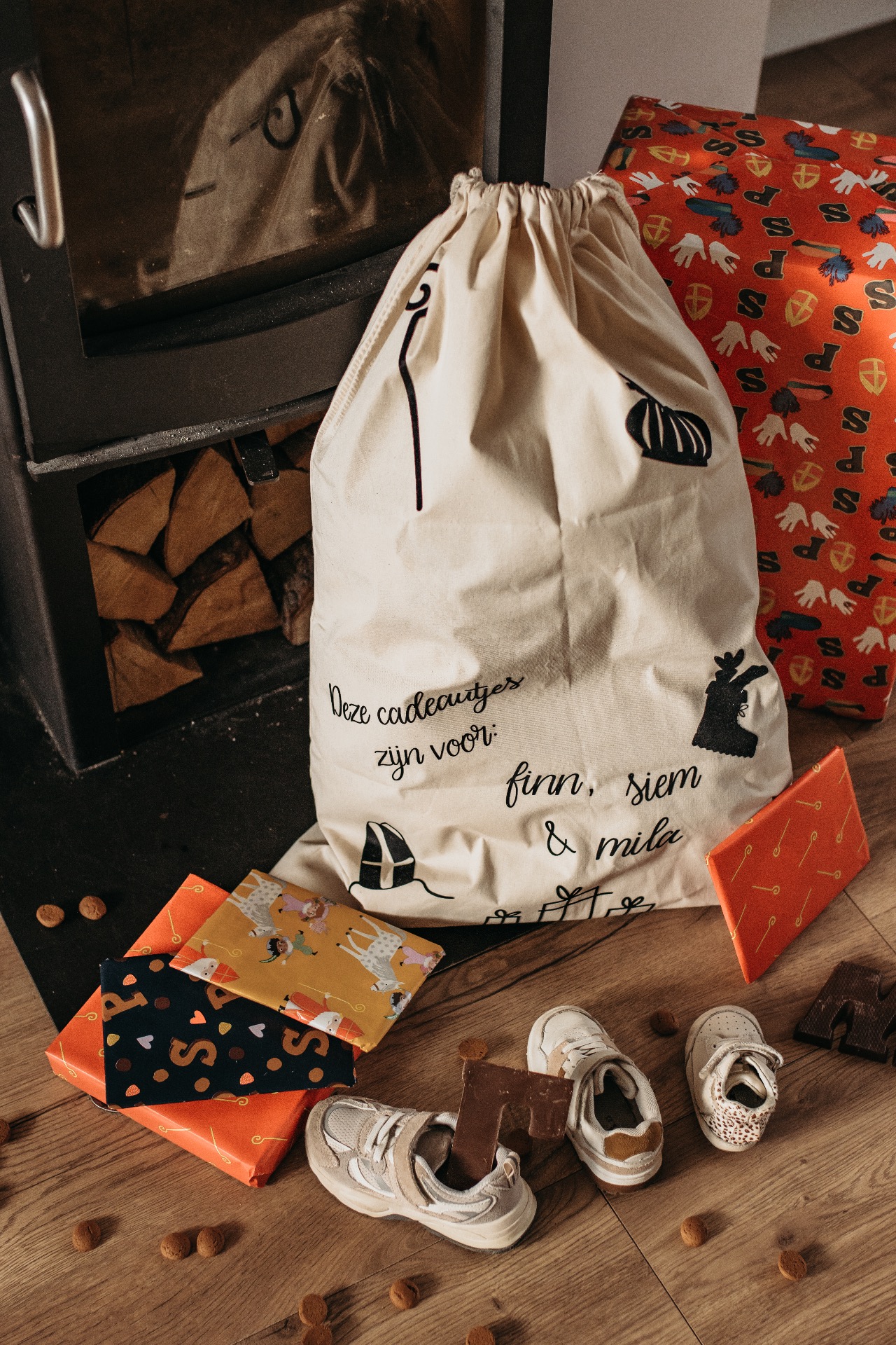 De zak en muts worden gepersonaliseerd. Bij het doorlopen van het betaalmenu, in de allerlaatste stap, kan je de gewenste naam/namen doorgeven.